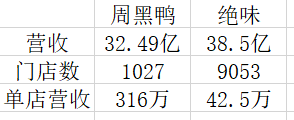 周黑鴨用直營模式的1000家店做出了絕味加盟模式9000家店營收的85%,單店營收是絕味的8.5倍。