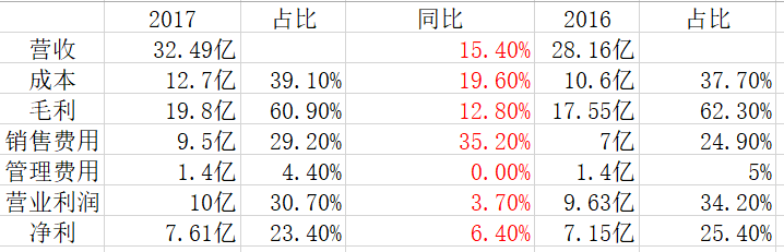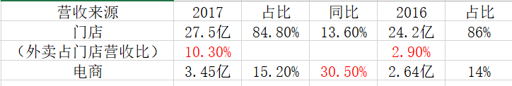 第三個問題:銷售費用大幅增長,是由於門店網絡的加深擴張導致租賃開始以及銷售及營銷員工薪金福利上漲,及更多城市及交通樞紐投放更多廣告所致,也有部分原因來自電商及外賣平臺的銷售增長、支付平臺服務費和快遞費。從數據上可以看出來,外賣佔門店營收比從2016年的2.9%提升至2017年的10.3%,增速很快。電商方面的增速也大大快於營收增速。