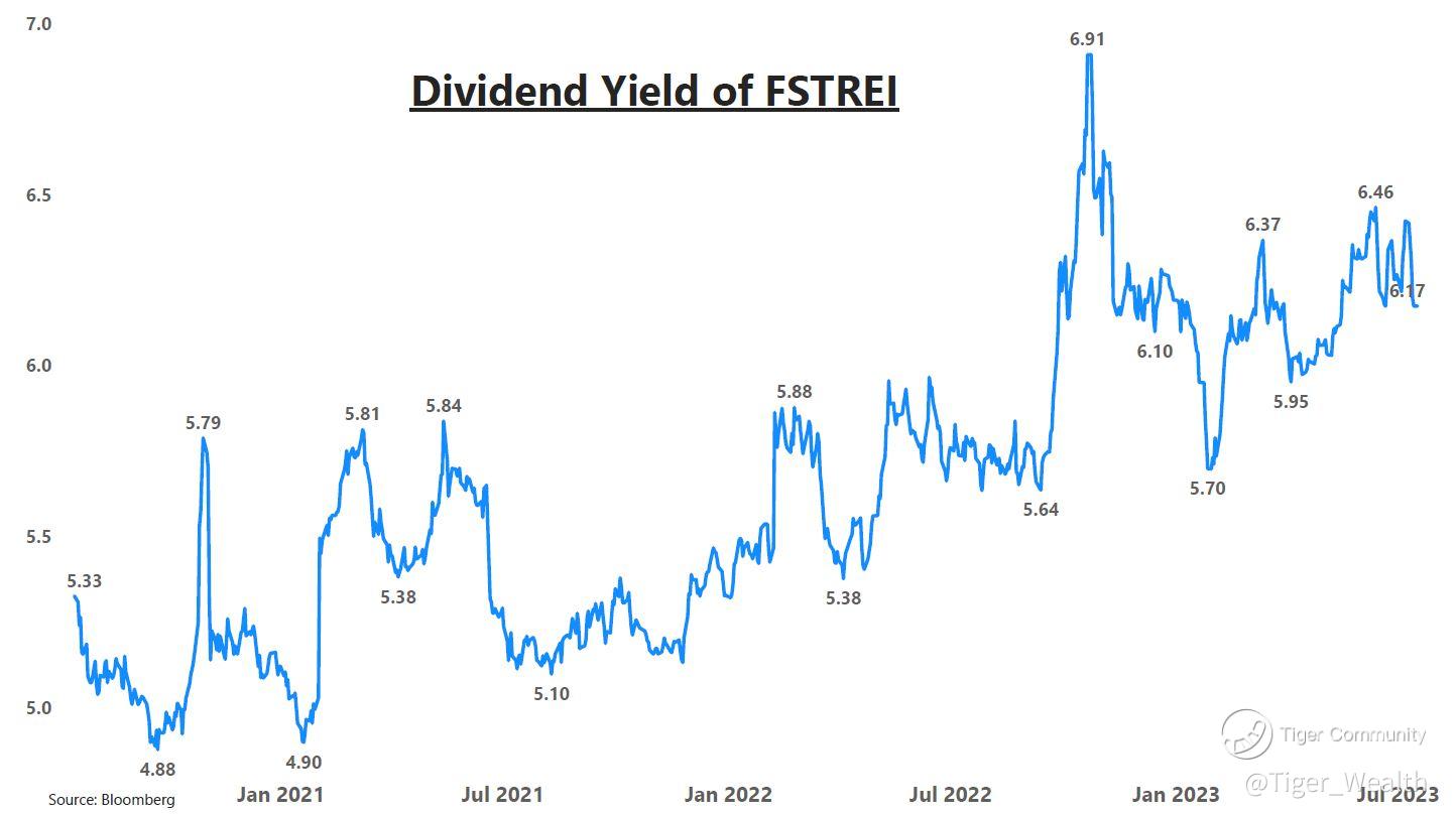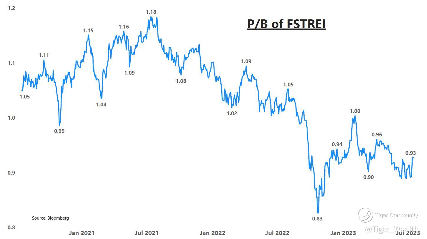 Currently, the Singapore REITS is trading at 6.2% dividend yield and 0.93x P/B, as indicated by the FTSE ST All-Share Real Estate Investment Trusts Index.