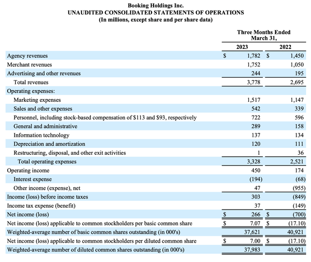 Let's now go through Booking's latest quarterly results in greater detail. The Q1 earnings summary is shown below: