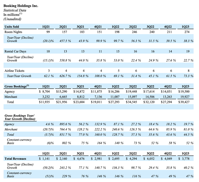 The company noted all-tie records in both room nights sold and gross bookings dollars, which grew 38% y/y to 274 million and 44% y/y (52% on an FX-neutral basis) to $39.4 billion, respectively. As has been the case over the past several quarters, the company's merchant-model bookings (which the company is very focused on growing) exhibited much faster 81% y/y growth.