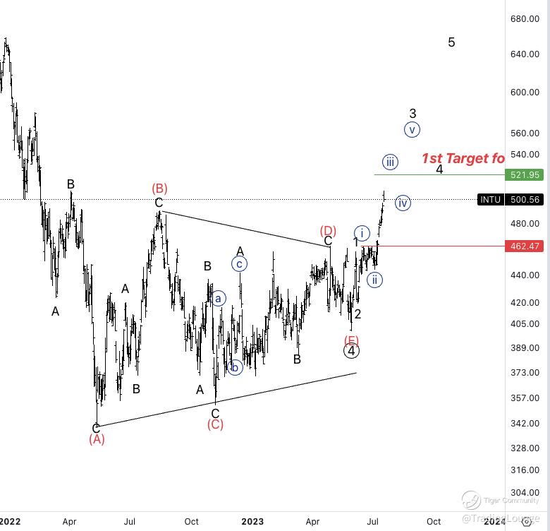 INTU Stock Market Analysis: As we keep moving higher the idea that the triangle in wave 4 is finished has been confirmed. At this point we are purely looking for upside resumption. You can see the 1st target for minor wave 3 which could be most likely surpassed.
