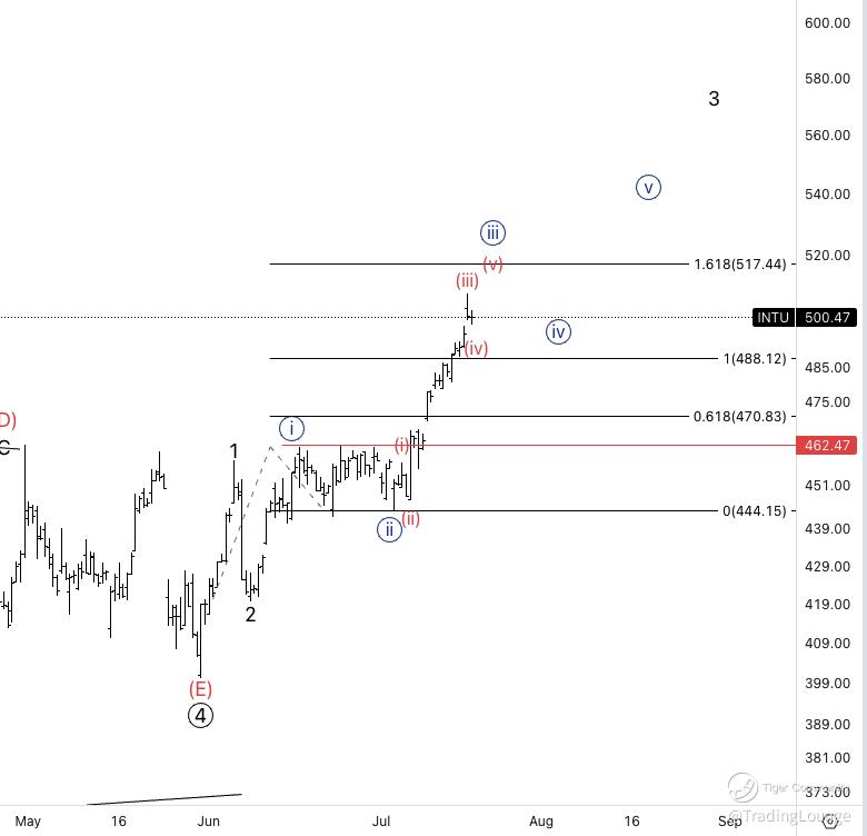 INTU Trading Strategy: Looking for longs into wave {v} once we see a bit of a larger pullback in wave {iv}.