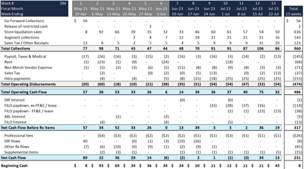 The final DIP order filed June 14 included a budget. Cash from store liquidations is forecasted to total $636 million.