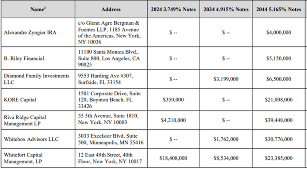 Holders of the unsecured notes are holding "lottery tickets" hoping for some type of recovery, even if just some token "gift" from a higher priority class under a Ch.11 plan or they might be able to get a token amount from a liquidating trust. At least there is an ad hoc group of unsecured noteholders that are asserting their interests during the bankruptcy process, which actually did happen during the June 14 hearing. BBBYQ shareholders currently do not have any group asserting their interests. Below are the members of this group (docket 703):