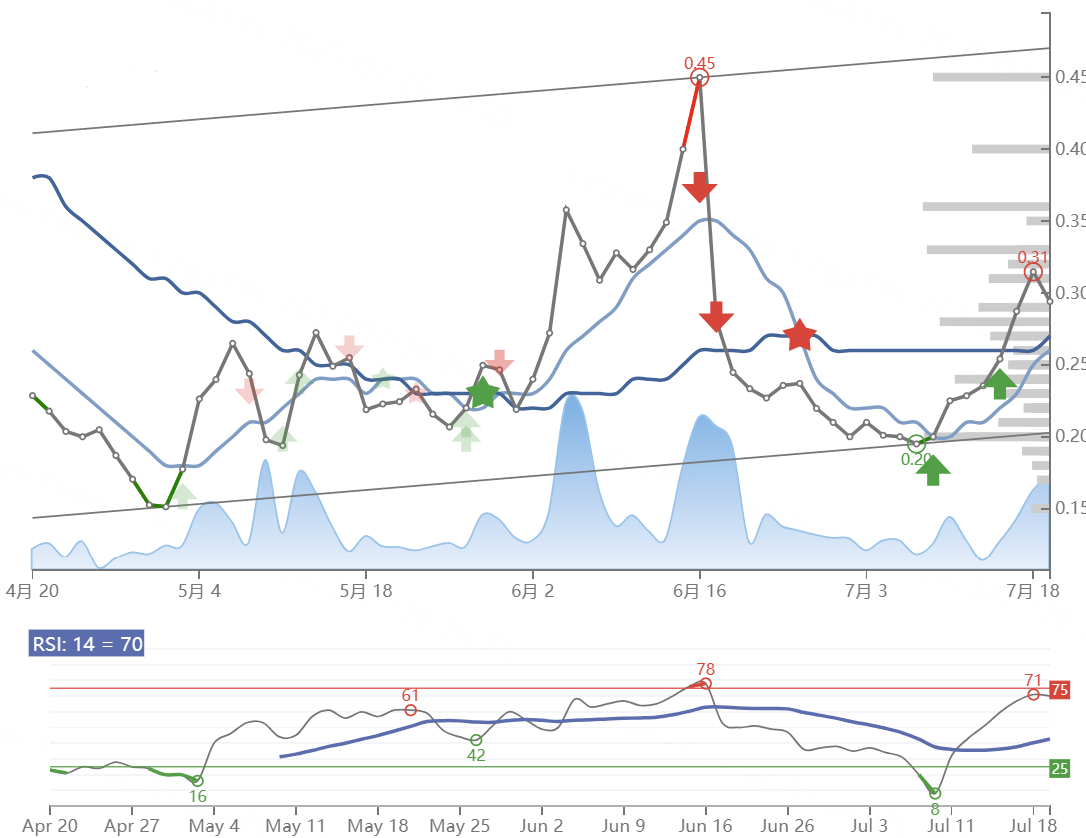 This stock may move very much during the day (volatility) and with a very large prediction interval from the Bollinger Band this stock is considered to be "very high risk". During the last day, the stock moved $0.0611 between high and low, or 21.57%. For the last week, the stock has had daily average volatility of 15.55%.
