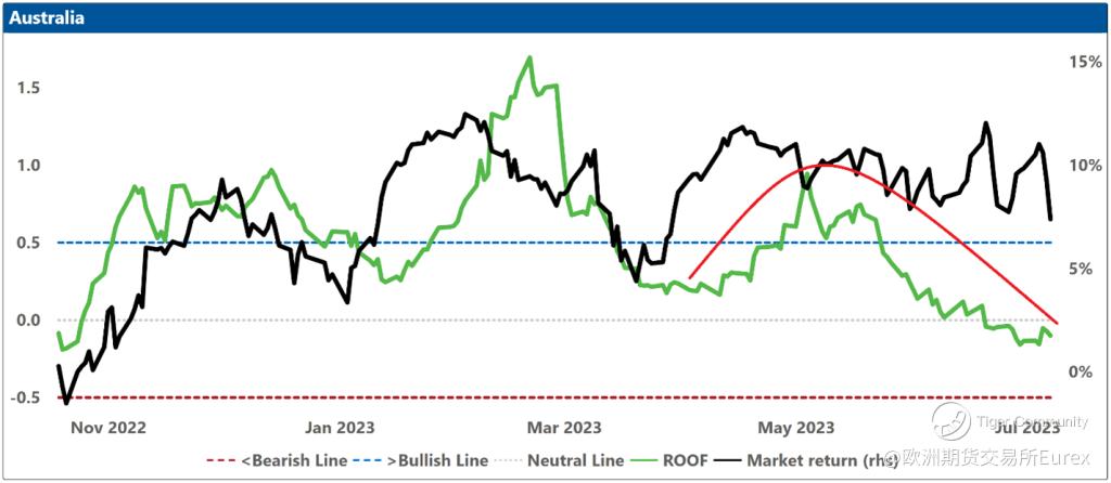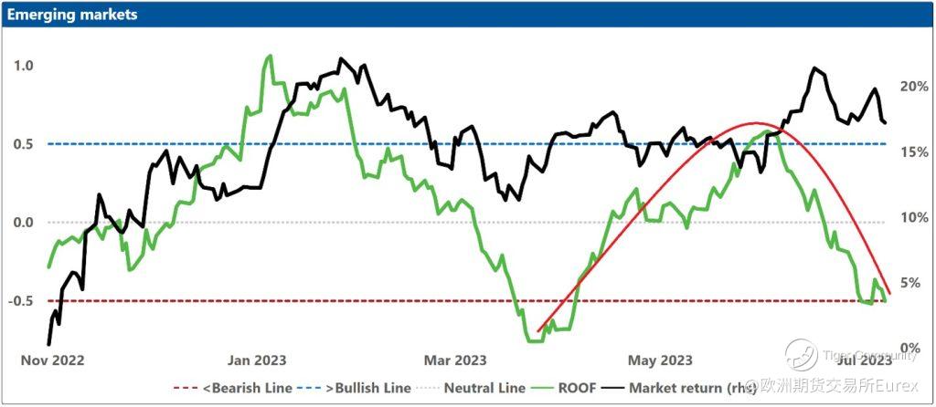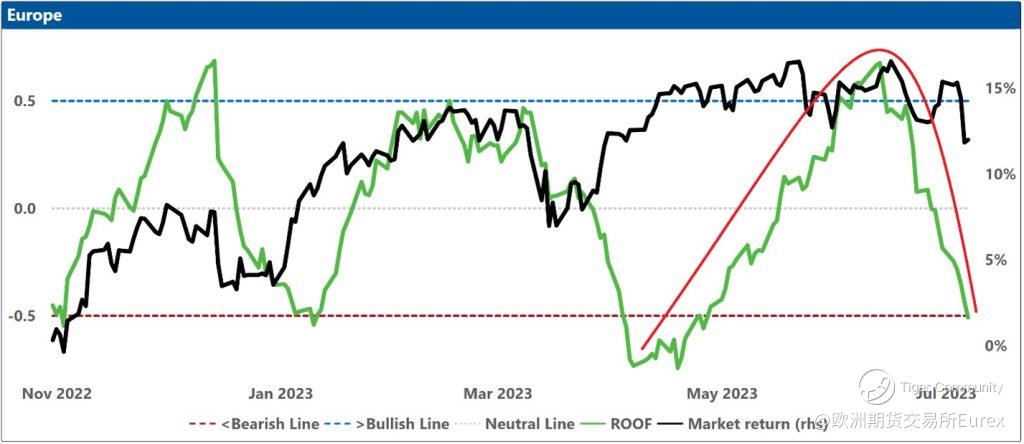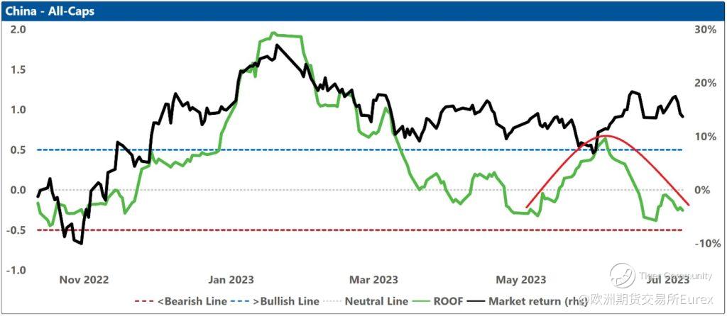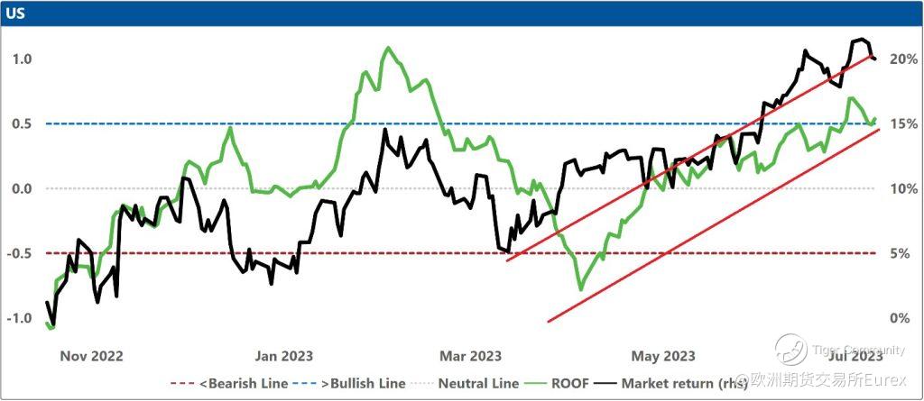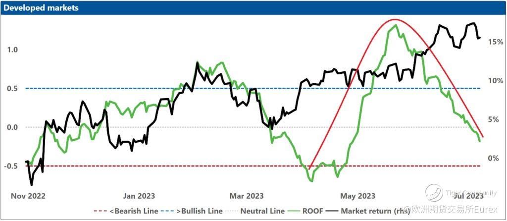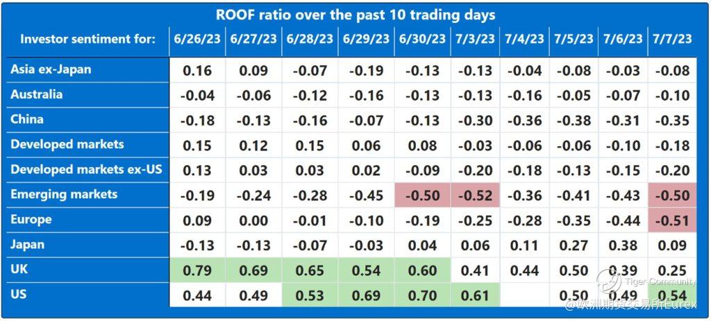How to read these charts: The top charts show the ROOF ratio (investor sentiment) in green (left axis), against the cumulative returns of the underlying market in black (right axis). The horizontal red line at -0.5 (left axis) represents the frontier between a negative sentiment (-0.2 to -0.5) and a bearish one (<-0.5), and the horizontal blue line at +0.5 (left axis) represents the frontier between a positive sentiment (+0.2 to +0.5) and a bullish one (>+0.5). In between those two lines, sentiment can be considered neutral (-0.2 to +0.2).