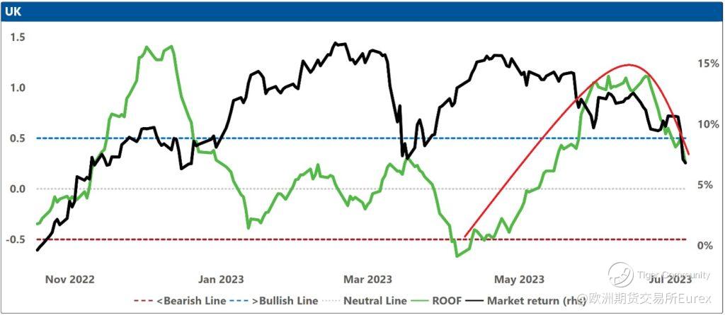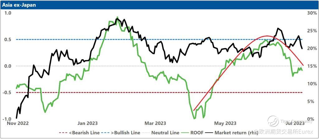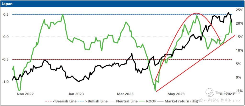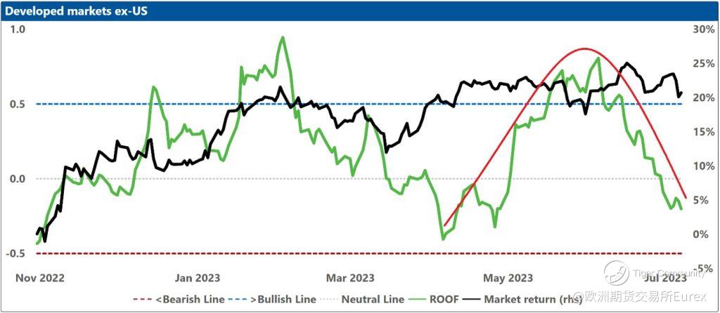 Investor sentiment fell another notch last week in all markets we follow, taking stock prices down with it — perhaps we are seeing a new adage in the making: “Sell in July and don’t ask why”? Following the banking sector’s near-death experience in March, sentiment rose in April and May only to reverse course in June. As of last week, all markets except Japan and the US have completed their turnaround in sentiment. Japan saw its reversal aborted by a late June rebound, keeping sentiment on an uptrend for now, but falling short of recovering the May 26 high, and ending last week neutral. In the US, a combination of low earnings expectations2, a predictable central bank, and a defiant economy have helped sentiment remain bullish.