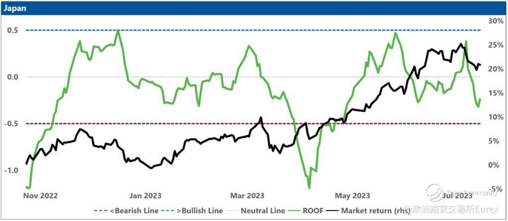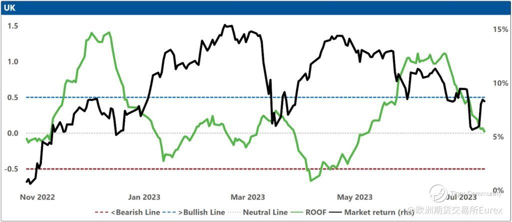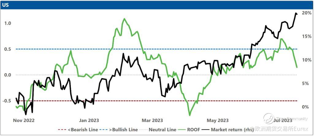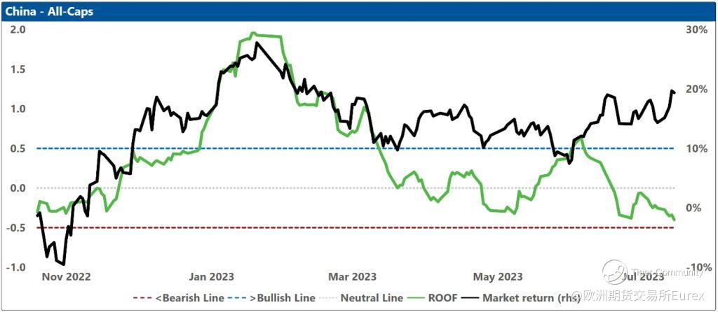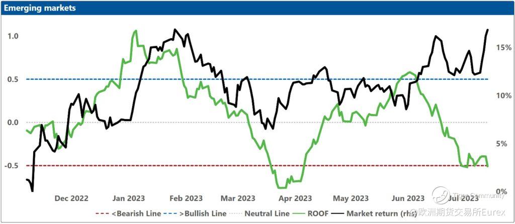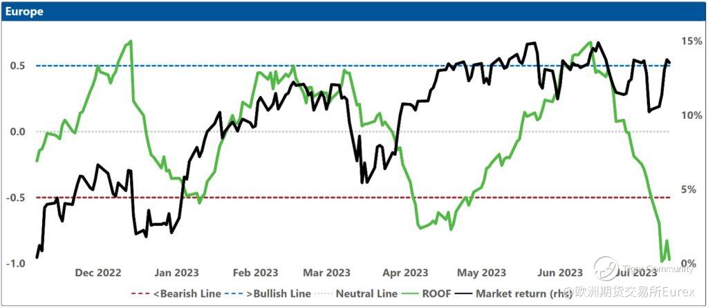 How to read these charts: The top charts show the ROOF ratio (investor sentiment) in green (left axis), against the cumulative returns of the underlying market in black (right axis). The horizontal red line at -0.5 (left axis) represents the frontier between a negative sentiment (-0.2 to -0.5) and a bearish one (<-0.5), and the horizontal blue line at +0.5 (left axis) represents the frontier between a positive sentiment (+0.2 to +0.5) and a bullish one (>+0.5). In between those two lines, sentiment can be considered neutral (-0.2 to +0.2).