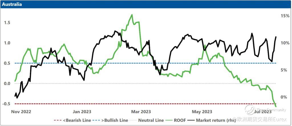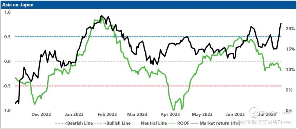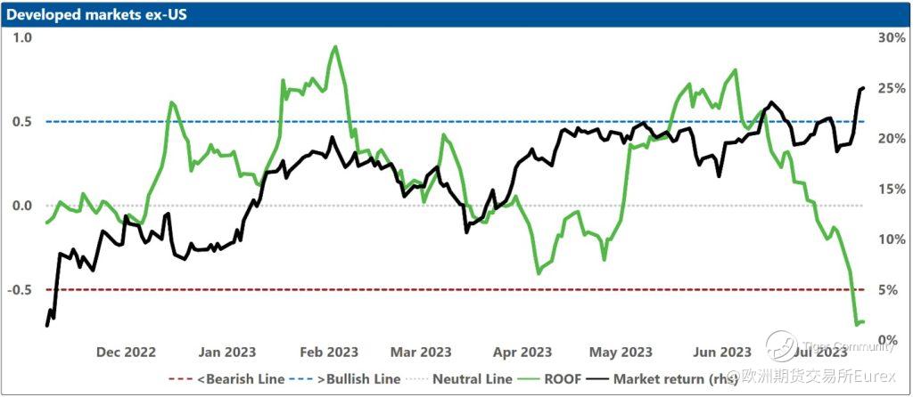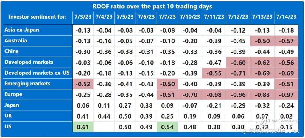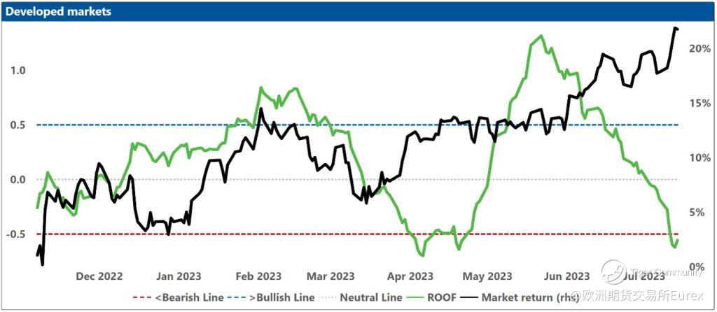 Investor sentiment continued to decline last week across all markets we follow, ending at fresh 2023 lows in Australia, China, Developed ex-US Markets and Europe (with Developed Markets narrowly escaping that fate — for now). Sentiment in five of the ten markets we cover turned bearish last week, with sentiment in China on the brink of joining them. Sentiment among US investors went from bullish the previous week to neutral last week, thanks to a better-than-expected inflation report for June, and stronger-than-feared Q2 earnings (with only 6% of companies reporting). This has prevented investors from turning negative just yet. Elsewhere, the market rallies seen globally except Japan seem out of sync with a weakening sentiment and may not be sustainable.