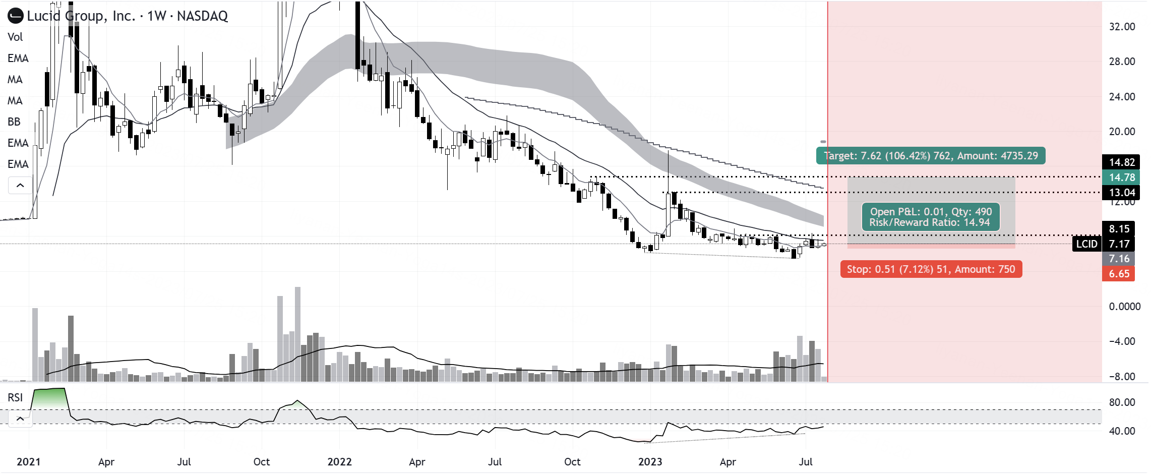 Swing trade with a bullish divergence confirmation on the weekly chart. Since the EV sector is on the bullish run with being the top volume gainers to support. We might see a climax run on this sector. $Lucid Group Inc(LCID)$