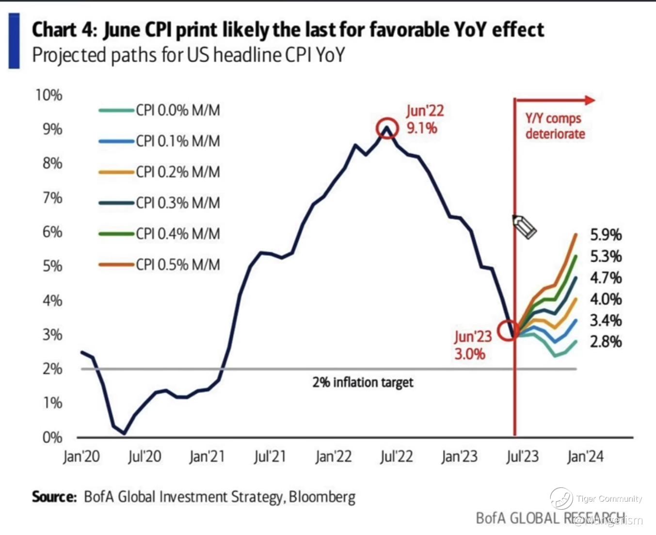 In recent weeks, oil prices have risen to a 3 months high and food prices have risen, driven by collapse of the Black Sea grain deal & india curbing rice export. These two price increases will reverse the factors that lead to the soft June CPI numbers. In fact BoA believes that June CPI print maybe the last for favorable YoY effect and project that inflation may rise again ( see their projection in the attached chart).