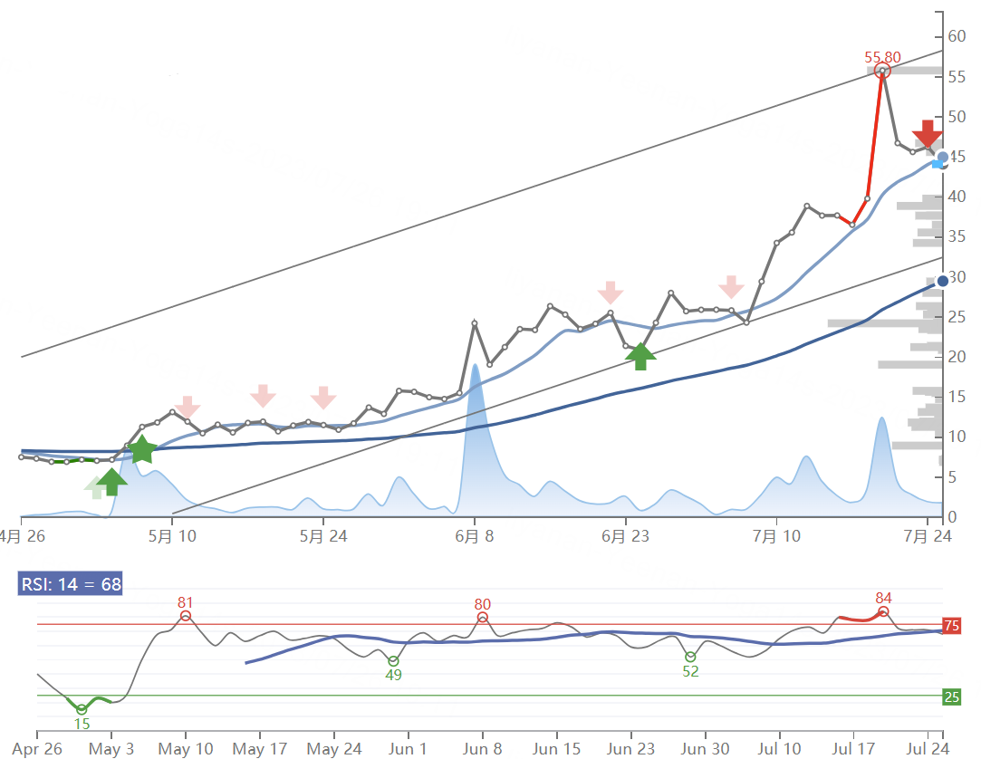 The Carvana $Carvana Co.(CVNA)$ stock price fell by -4.61% on Tuesday, 25th Jul 2023 from $46.24 to $44.11. During the last trading day the stock fluctuated 10.23% from a day low at $43.91 to a day high of $48.40. The price has been going up and down for this period, and there has been a 24.01% gain for the last 2 weeks. Volume fell on the last day along with the stock, which is actually a good sign as volume should follow the stock. On the last day, the trading volume fell by -1 million shares and in total, 21 million shares were bought and sold for approximately $909.41 million.