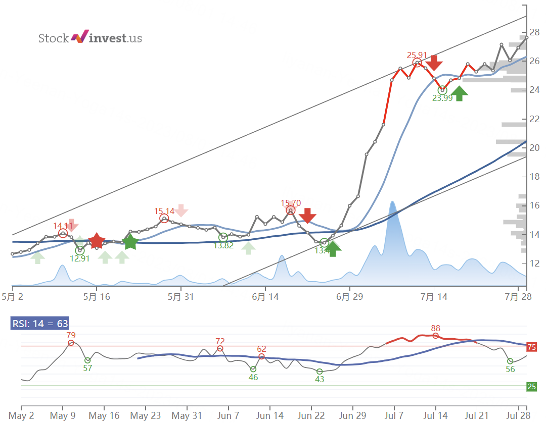 The Rivian Automotive $Rivian Automotive, Inc.(RIVN)$ stock price gained 2.60% on Monday, 31st Jul 2023, rising from $26.94 to $27.64. During the last trading day the stock fluctuated 4.40% from a day low at $26.61 to a day high of $27.78. The price has risen in 7 of the last 10 days and is up by 15.21% over the past 2 weeks. Volume fell on the last day by -12 million shares and in total, 37 million shares were bought and sold for approximately $1.02 billion. You should take into consideration that falling volume on higher prices causes divergence and may be an early warning about possible changes over the next couple of days.