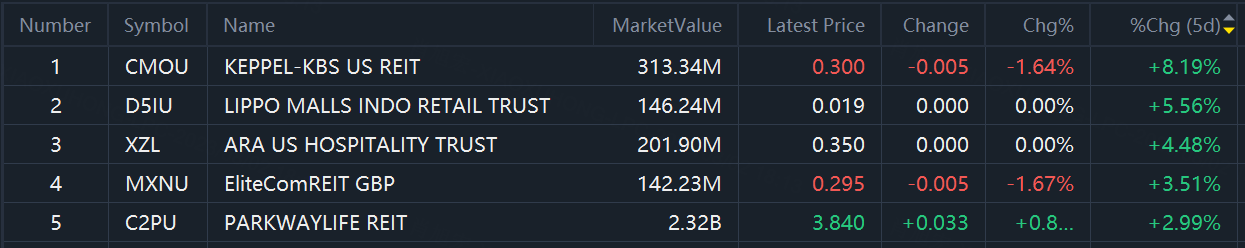 $KEPPEL-KBS US REIT(CMOU.SI)$ , $LIPPO MALLS INDO RETAIL TRUST(D5IU.SI)$ , $ARA US HOSPITALITY TRUST(XZL.SI)$ , $EliteComREIT GBP(MXNU.SI)$ , $PARKWAYLIFE REIT(C2PU.SI)$