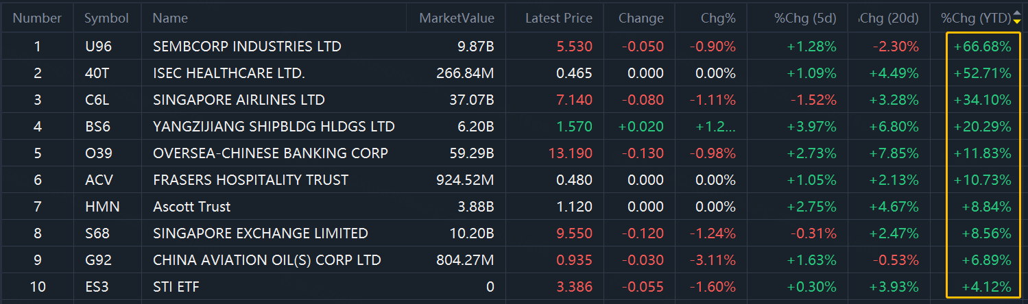 $SEMBCORP INDUSTRIES LTD(U96.SI)$ , $ISEC HEALTHCARE LTD.(40T.SI)$ , $SINGAPORE AIRLINES LTD(C6L.SI)$ , $YANGZIJIANG SHIPBLDG HLDGS LTD(BS6.SI)$ $OVERSEA-CHINESE BANKING CORP(O39.SI)$, $FRASERS HOSPITALITY TRUST(ACV.SI)$ , $FRASERS HOSPITALITY TRUST(ACV.SI)$, $Ascott Trust(HMN.SI)$ $SINGAPORE EXCHANGE LIMITED(S68.SI)$ ,$CHINA AVIATION OIL(S) CORP LTD(G92.SI)$ , $STI ETF(ES3.SI)$