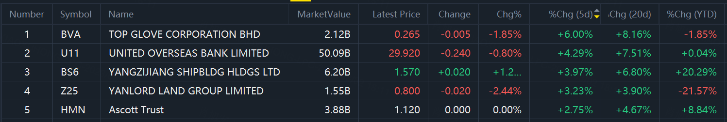 As of August 2, 2023, the $Straits Times Index(STI.SI)$ closed at 3325.02, representing a performance of 2.27% in 2023. Below are some data about the SGX market for the past 5 trading days.