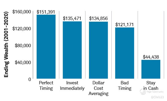 After 20 years of investing, four hypothetical investors who invested $2,000 a year would have ended up at $151,391 with perfect timing; $135,471 investing immediately; $134,856 with dollar-cost averaging; $121,171 with bad timing; and $44,438 invested in cash investments.