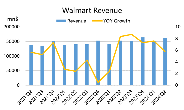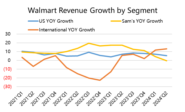 otal revenue reached $161.6 billion, a year-on-year increase of 5.9%, higher than the market's expected $159.7 billion. Walmart's US revenue reached $110.9 billion, a year-on-year increase of 5.44%; Walmart International's total sales increased by 13.3% this quarter, reaching $27.6 billion. Sam's Club's revenue was $21.8 billion, a year-on-year decrease of 0.32%.