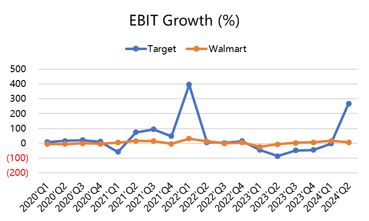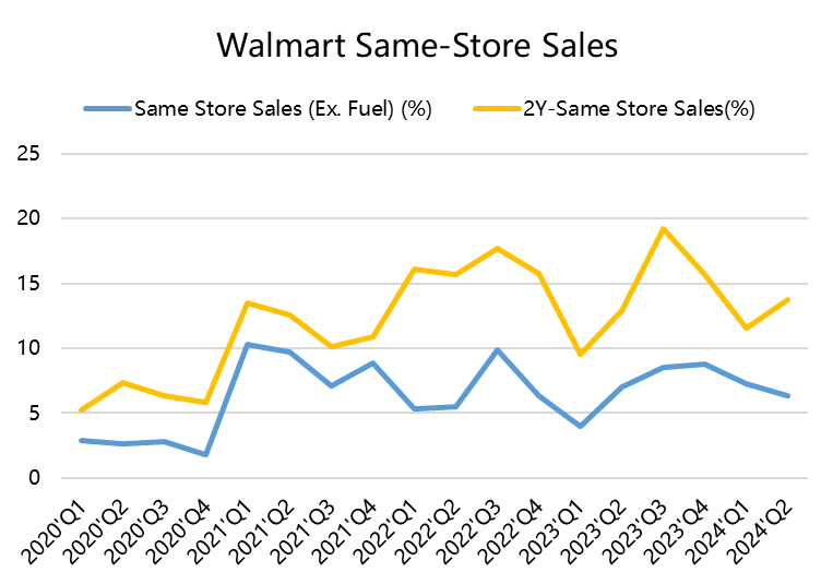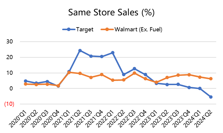 In terms of same-store sales, Target fell this quarter due to sluggish sales, but Walmart still recorded growth, especially in the US where same-store growth was 6.4%.