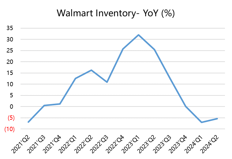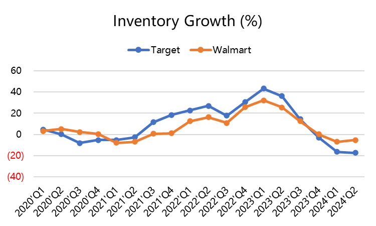 In terms of inventory, both companies' inventories accumulated rapidly in the early stage of inflation, but Walmart's inventory control and logistics cost control were more timely. Since last year, inventory growth rates have started to decline and turned negative two quarters ago.