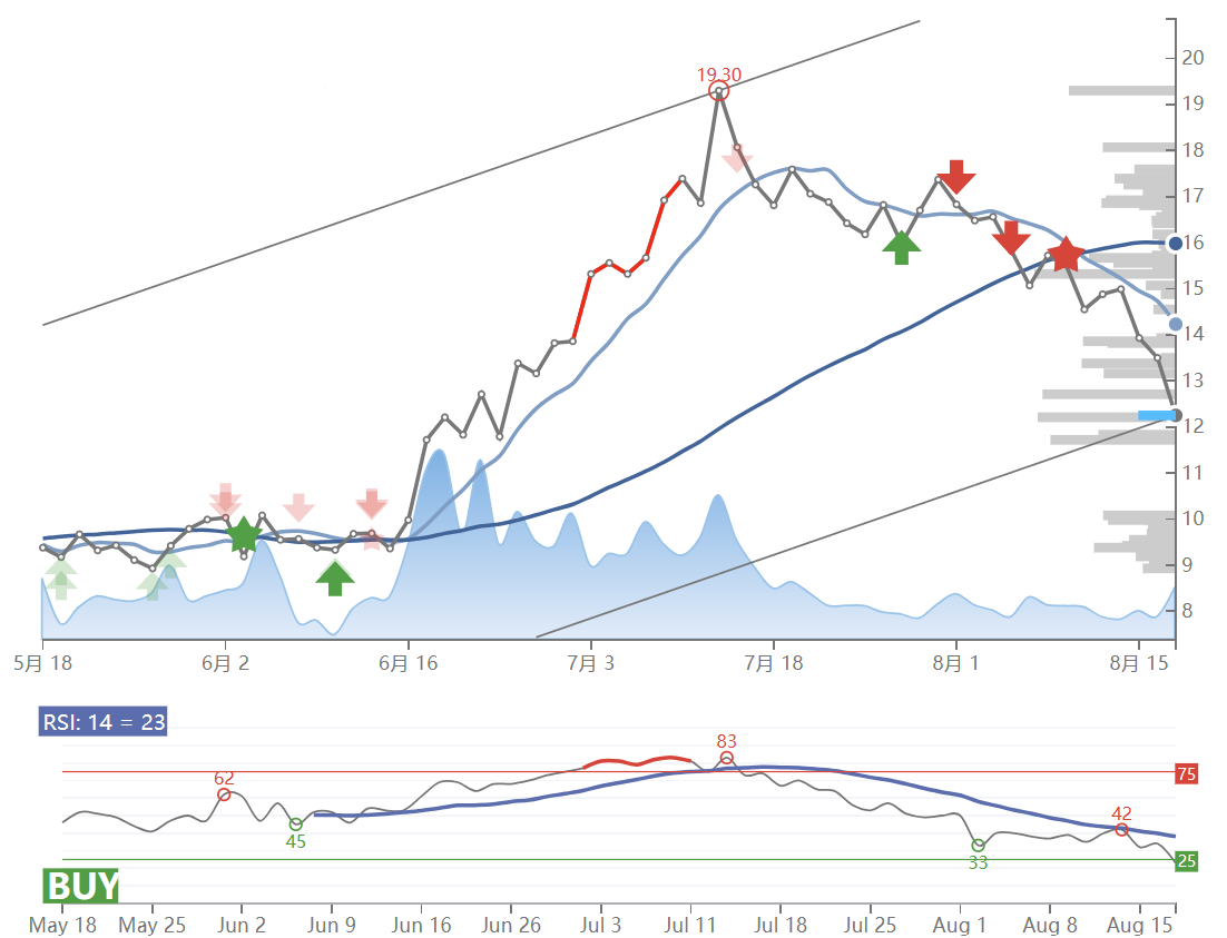 This stock may move much during the day (volatility) and with a large prediction interval from the Bollinger Band this stock is considered to be "high risk". During the last day, the stock moved $1.02 between high and low, or 8.36%. For the last week, the stock has had daily average volatility of 7.49%.