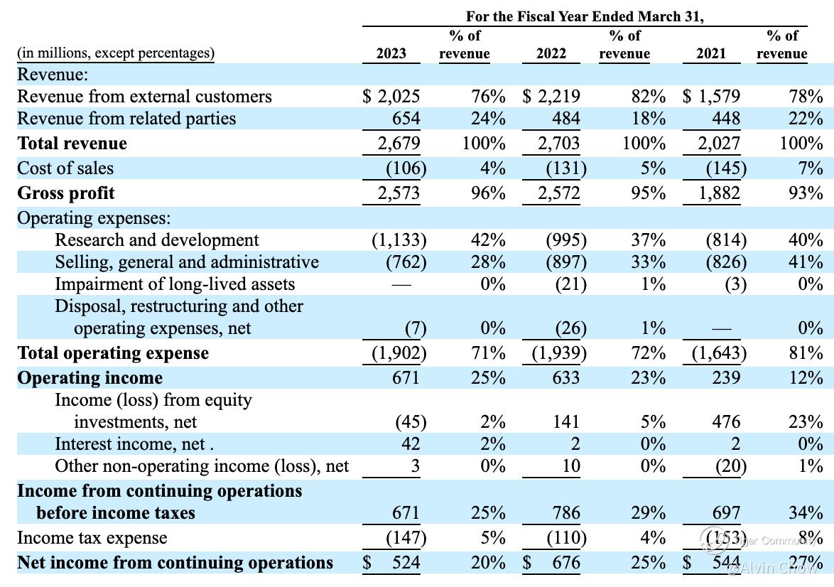 Given its absence of manufacturing costs, the company has achieved an impressive gross profit margin of 96% while its net profit margin stands at a respectable 20%. The majority of its expenditures are directed towards research and development (R&D), accounting for 42% of its revenue in FY2023. This commitment to R&D underscores that Arm is not resting on its laurel and has been developing the next generation of products.