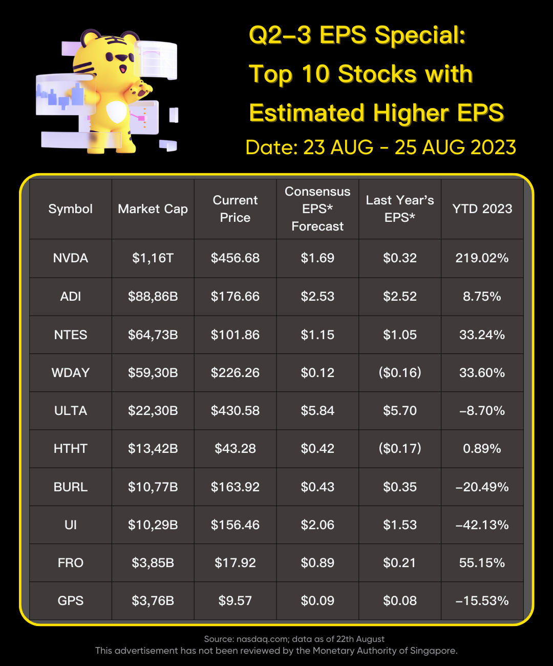 On Aug. 23-25, Stocks of $NVIDIA Corp(NVDA)$ , $Analog Devices(ADI)$ , $NetEase(NTES)$ , $Workday(WDAY)$ , $Ulta Salon Cosmetics & Fragrance(ULTA)$ , $H World Group(HTHT)$ , $Burlington(BURL)$ , $Ubiquiti Inc.(UI)$ , $FRONTLINE PLC(FRO)$ , $Gap(GPS)$ are going releasing their earnings, and their consensus earnings per share forecasts are higher than data from the same period last year. Are you interested in betting on these stocks?