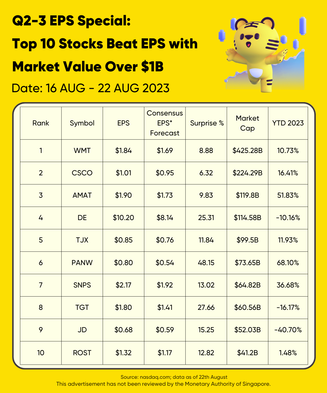 On August 16~22, $Wal-Mart(WMT)$ , $Cisco(CSCO)$ , $Applied Materials(AMAT)$ , $John Deere(DE)$ , $TJX Companies(TJX)$ , $Palo Alto Networks(PANW)$ , $Snap Inc(SNAP)$ , $Target(TGT)$ , $JD.com(JD)$ , $Ross(ROST)$ released earnings, and we see mixed performance after the results.