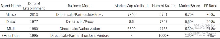 According to Frost & Sullivan’s statistics of global retail markets, Miniso, Daiso, MUJI, Flying Tiger, and Sanfu are 5 leading enterprises in self-owned brand retail companies in the industry, dominating 20.3% market share. Among CR5, MINISO, with the latest date of establishment and overseas expansion, owns the most rapid speed of expansion and the largest market share now.