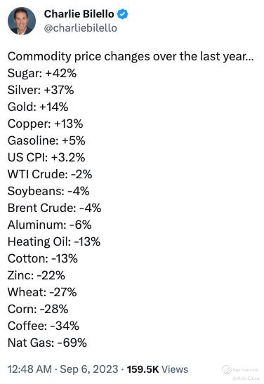 However, it's worth noting that other commodity prices show a mixed pattern. For instance, sugar prices have risen by 42%, while natural gas prices have dropped by 69% compared to a year ago. Therefore, the direction of inflation remains uncertain, as there is no clear trend in commodity prices.