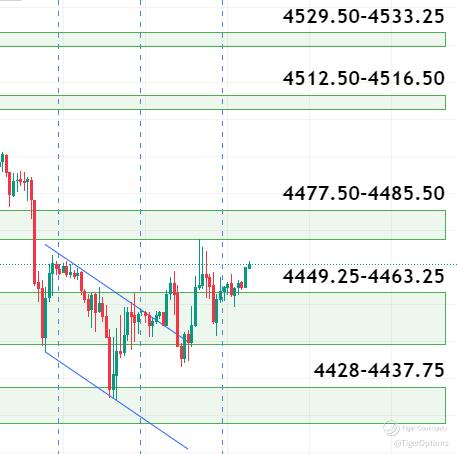 Presently, the S&P 500 futures market is in a consolidation phase, showcasing signs of a potential shift in momentum. Notably, higher lows have been established, which is a positive development. To foster a short-term bullish outlook, it would be advantageous if the price successfully retests and maintains levels above 4447.50. Such a move would signal a higher low, raising the probability of an eventual breakout to the upside.