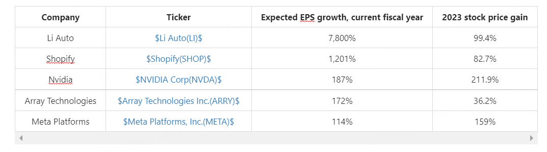AI leader $NVIDIA Corp(NVDA)$, $Shopify(SHOP)$, $Meta Platforms, Inc.(META)$ , $Li Auto(LI)$ , $Array Technologies Inc.(ARRY)$ are expected to more than double earnings per share in 2023 or current fiscal year, some by far more. And they're all near buy points, with several actionable now.