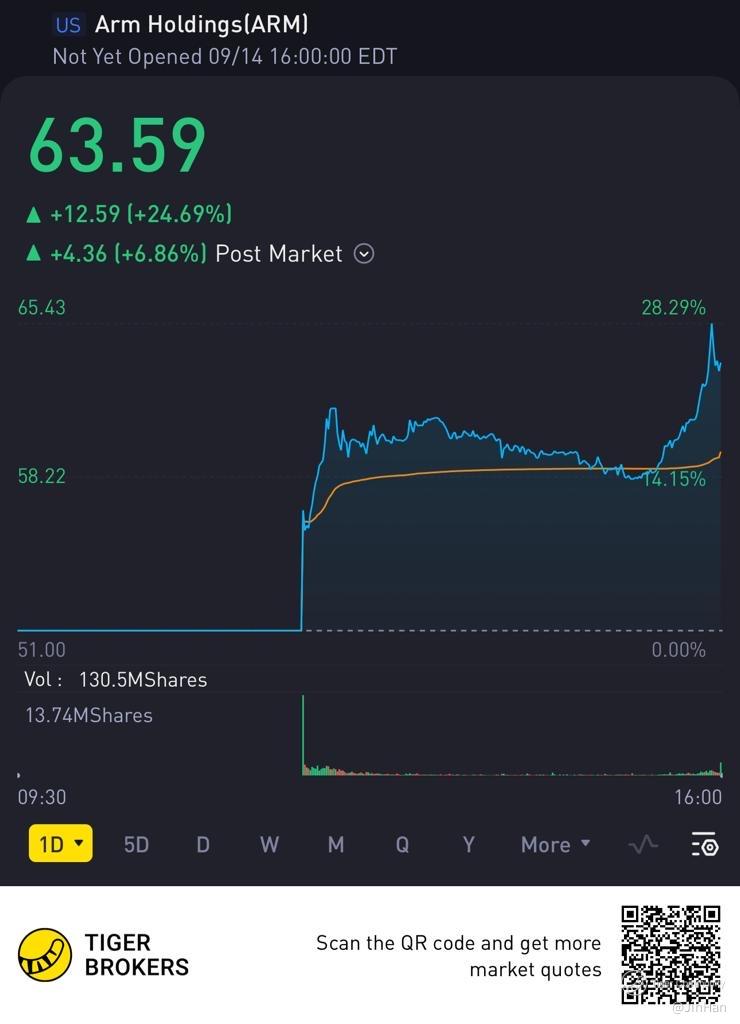 $Arm Holdings(ARM)$ The recent IPO of ARM made waves in the investment world, with shares closing at $63.59 on the first day of trading—a remarkable 20% surge from its initial offering price. While this performance may have been exhilarating for some, I’ve chosen a more measured approach to this hotly anticipated debut.