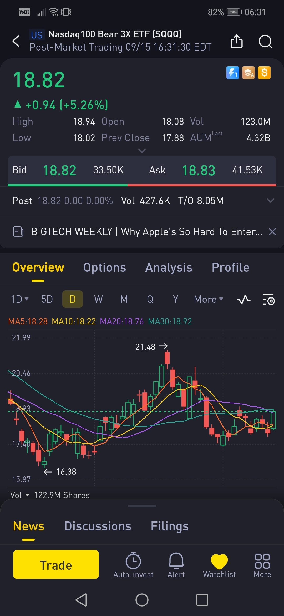 is up 5% today. SQQQ seeks a return that is - 3x the return of its underlying index which is the Nasdaq 100 for a single day. Due to the compounding of daily returns, it is not advisable to hold this ETF greater than 1 day as it will skew the results. SQQQ is a good ETF to hedge against an unexpected decline in the market and to profit from a Bearish market.