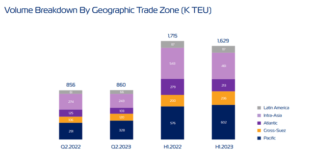 In H1 2023, ZIM carried 1,629 thousand TEUs, compared to 1,715 thousand TEUs in the first half of the previous year, with the average freight rate per TEU dropping significantly to $1,286 in the first half of 2023, down from $3,722 in the same period in 2022.