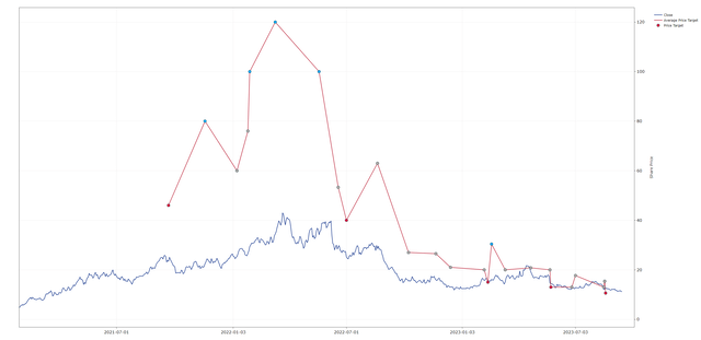 Looking at the evolution in price targets set by analysts, it's very apparent that overall sentiment is at the lowest for ZIM. Currently, the average price target set by analysts coincides with the current price, which could mean that the stock is relatively reasonably priced.