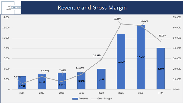 If we zoom out and look back to 2016, there has been a significant increase in Zim's revenue generation. Revenue steadily grew from 2016 to 2020 but skyrocketed to $10,729 million in 2021 and $12,562 in 2022. However, in TTM, we are starting to see a sharp decline.