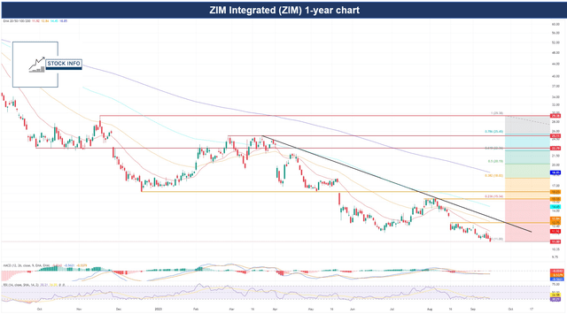 In this technical analysis, you will quickly notice that ZIM is currently trading at an all-time low. The stock closed at exactly $11 on Friday, September 15th, and now has no immediate level of support. In addition, the stock is currently in a pronounced downtrend, shown as the black line in the graph below.