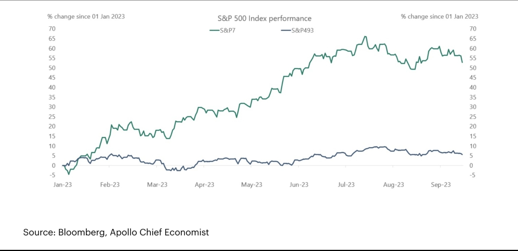 Been a while since I contributed. Before we go all bullish or bearish or pigish, or apeish, let's call these two charts to attention. First is bankruptcy filings which have already soared To GFC levels. The economy has fractured. It just takes time to be realised by the market. Typically a lag before it shows. Next, we have the S&P500. 7 of the top stocks in this basket are responsible for a 50% push. The rest of the 493 are nearly flat for the year. The Wall Street phrase goes - when the generals lead but the soldiers don't follow, beware.
