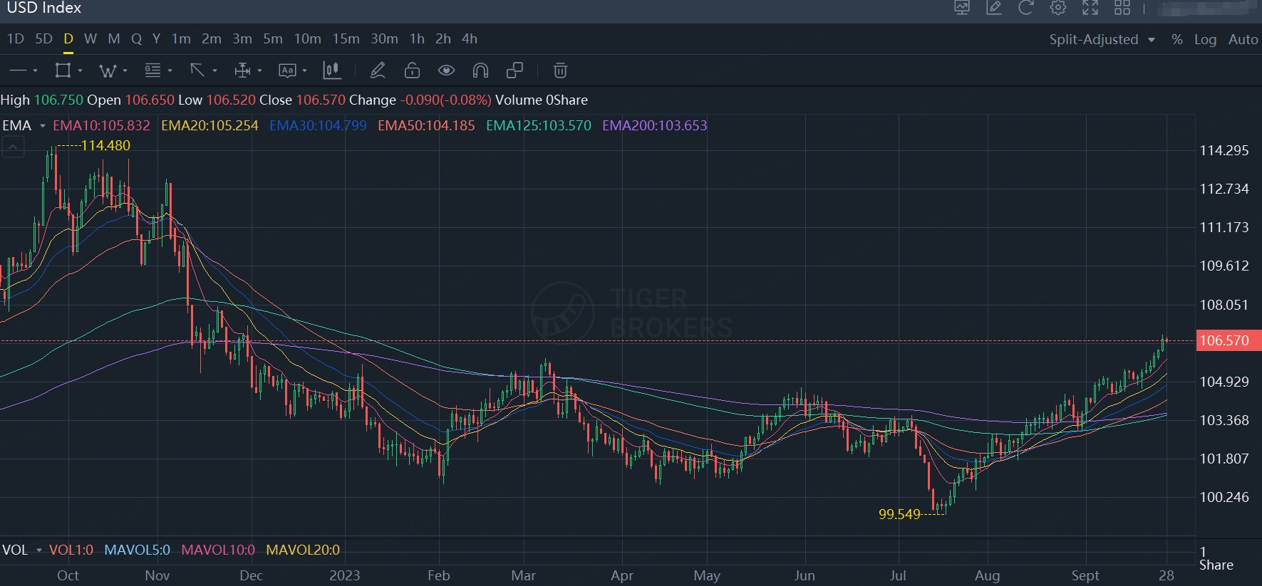 Regarding $USD Index(USDindex.FOREX)$, it has rises to highest since November 2022.