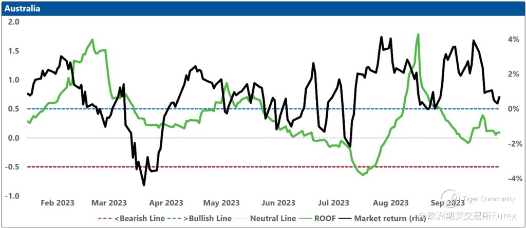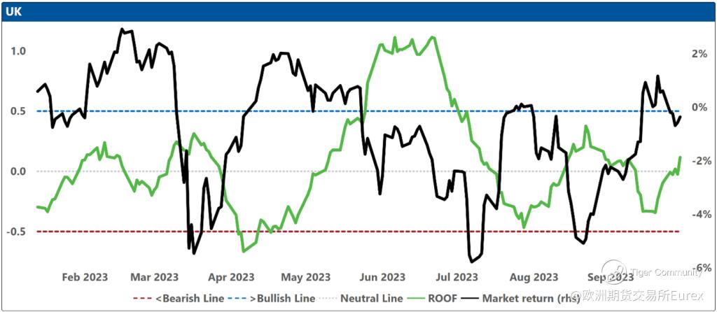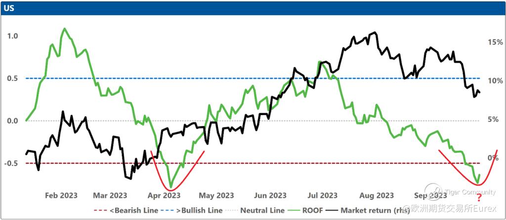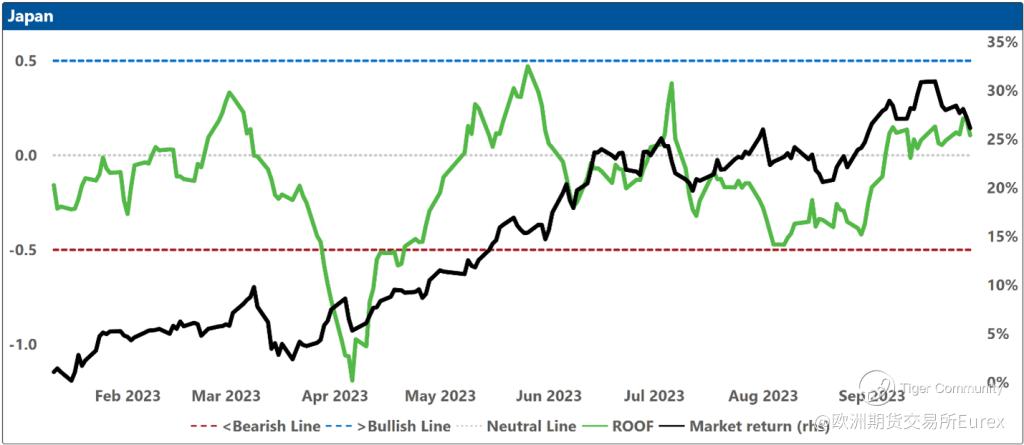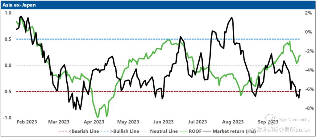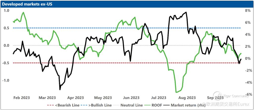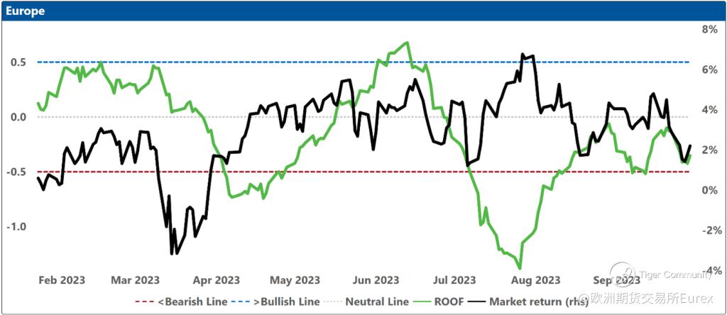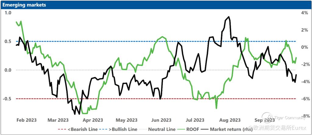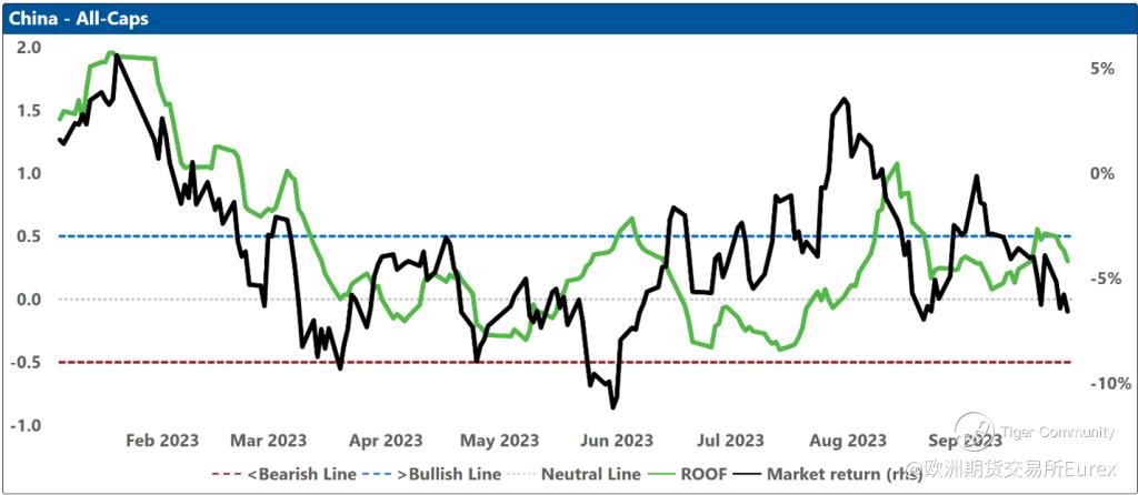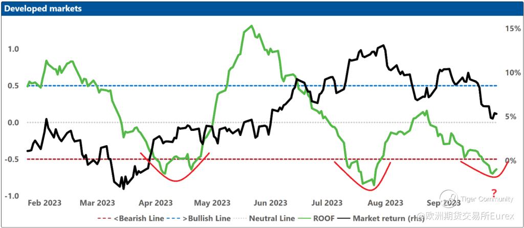 How to read these charts: The top charts show the ROOF ratio (investor sentiment) in green (left axis), against the cumulative returns of the underlying market in black (right axis). The horizontal red line at -0.5 (left axis) represents the frontier between a negative sentiment (-0.2 to -0.5) and a bearish one (<-0.5), and the horizontal blue line at +0.5 (left axis) represents the frontier between a positive sentiment (+0.2 to +0.5) and a bullish one (>+0.5). Around the horizontal grey line at 0.0 (left axis), sentiment can be considered neutral (-0.2 to +0.2).