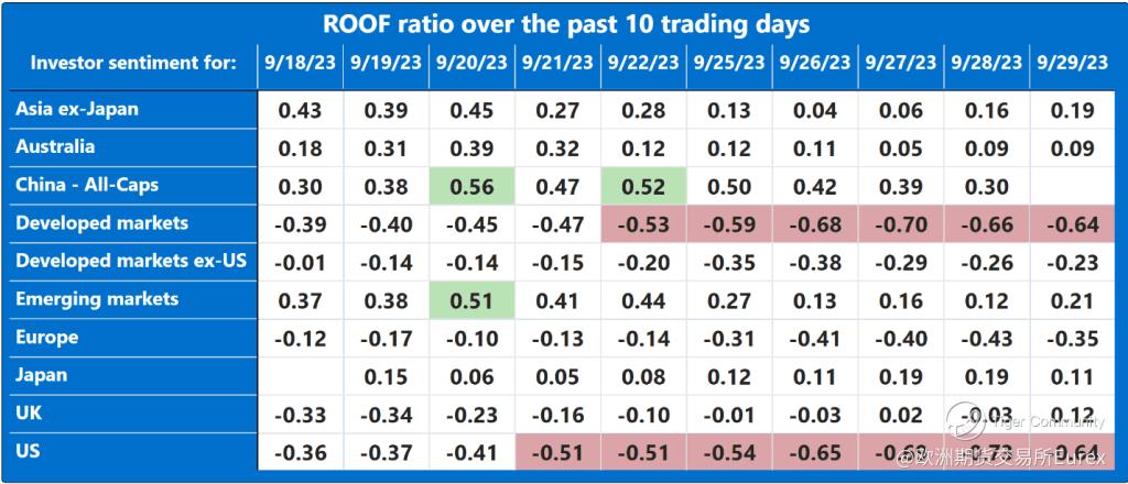 Investor sentiment saw a late week rebound in all markets we follow, except in Japan and global ex-US markets where it remained unchanged (China was closed on Friday). Concerns about the slowing global economy were made worse in the last two weeks, by worries about a potential US government lockdown and slowing Chinese manufacturing activity. Both concerns seem to have been avoided over the weekend with a last-minute deal for a continuing resolution in the US, funding the government until mid-November, and better than expected PMI data in China. While the Chinese market will remain closed for most of this week in celebration of the Golden Week festivities, we can expect sentiment to continue to recover across all other markets.