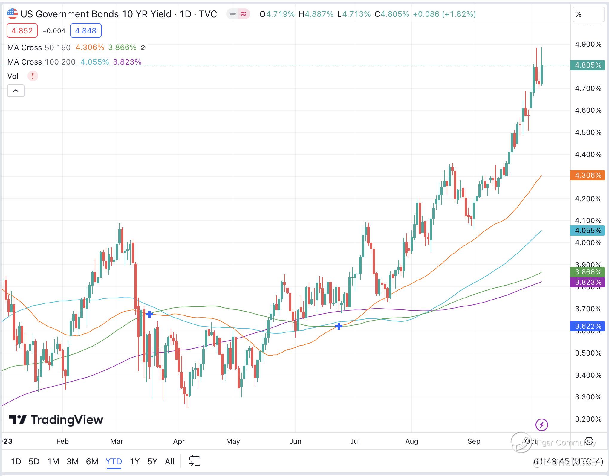 Since early August this year when the S&P 500 peaked around 4,600 points, the U.S. 10 Year Treasury yield has increased from below 4.0% to around 4.8%.