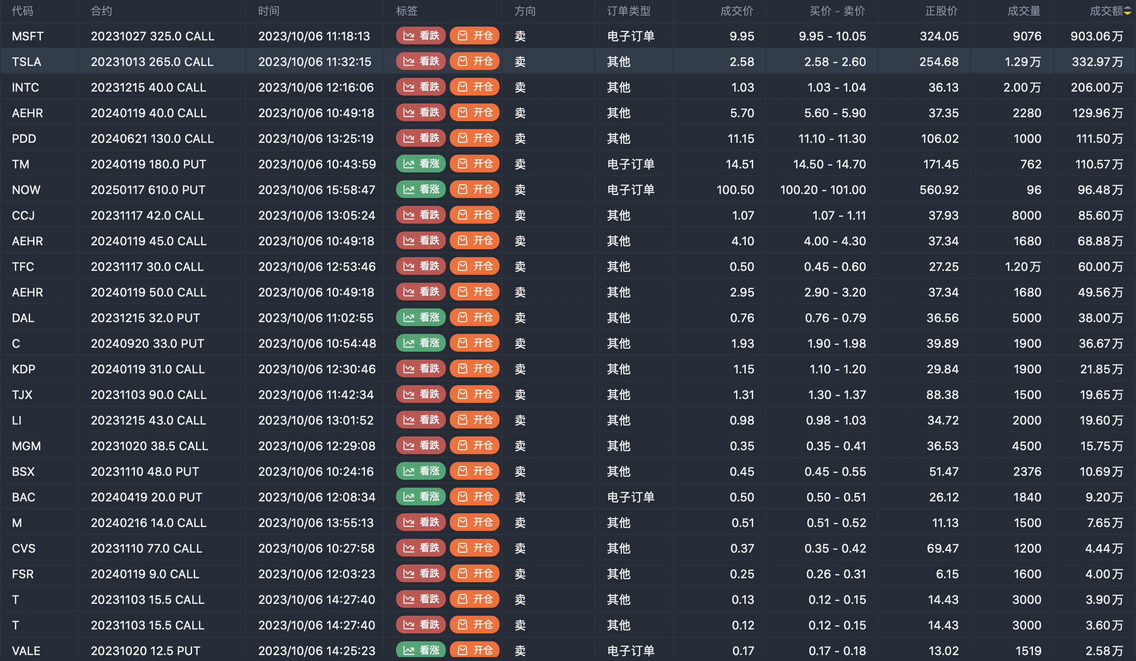 Note: This image data is from Tiger PC. This screen is a significant sell open position for an option contract in the market. A sell of a call option means that the trader believes that the underlying trend has peaked, and a sell of a put option means that the trader believes that the underlying trend has bottomed. These contract openings typically indicate significant activity in the underlying stock, including whether the trader is willing to accumulate a long or short option position.