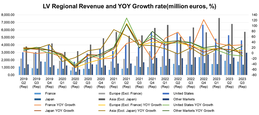 From a regional perspective, the main drag on LV in the third quarter was the United States and China. In the United States, revenue was 5.3 billion euros, marking a 10.2% year-on-year decline. In Asia (excluding Japan), revenue was 5.75 billion, with a 9% year-on-year decline. In Japan, revenue was 1.39 billion, with a 0.8% year-on-year growth, a significant drop from the 13.2% growth in the previous quarter. The French and European markets remained stable: