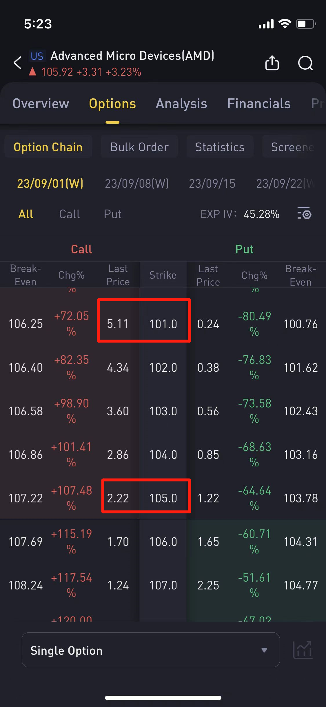 For example, let's consider AMD with a current stock price of $105. Suppose we expect its stock price to decline to $102 in the future. In this scenario, we can first buy a call option with a strike price of $105, incurring a premium cost of $2.22. At the same time, we sell a call option with a strike price of $101, receiving a premium income of $5.11. The net premium income from this strategy would be $2.89.