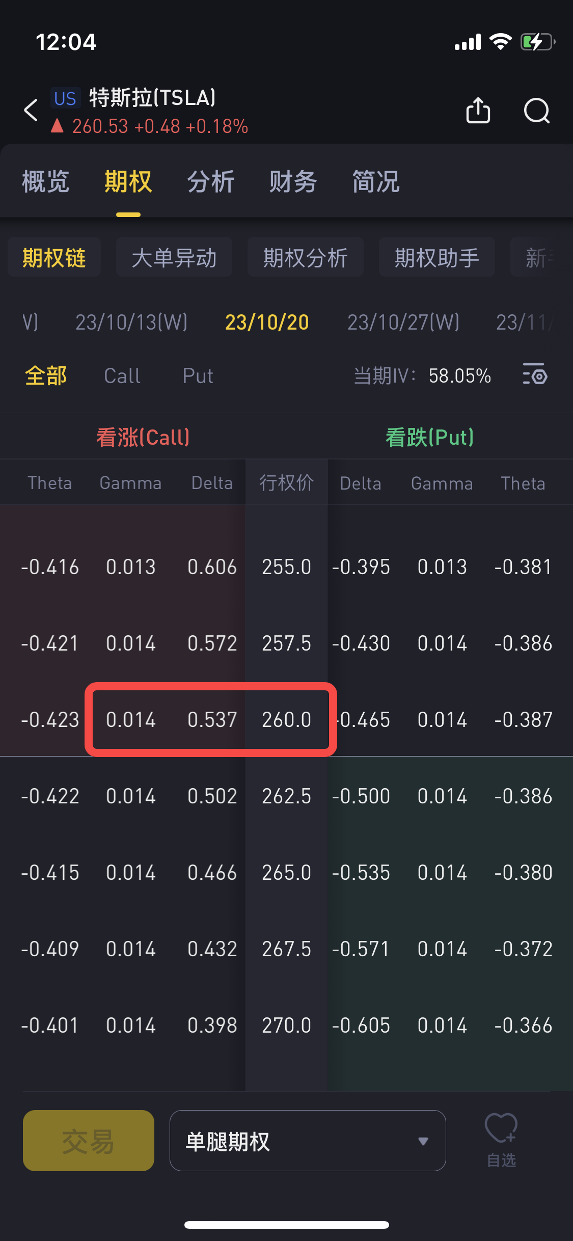 For example, if Tesla's stock price is currently around $260.53, and a call option with a strike price of $260 that expires on October 20, 2023, has a delta value of 0.537 and a gamma value of 0.014.
