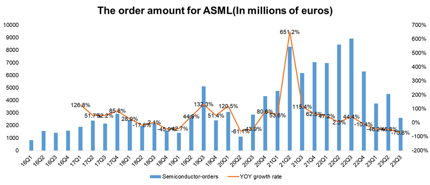 The Q3 orders amounted to 2.6 billion euros, reflecting a substantial 70.8% year-on-year decline. This was primarily due to capital expenditure reductions by semiconductor foundries. While the magnitude of the decline exceeded expectations, it wasn't entirely surprising given the circumstances.