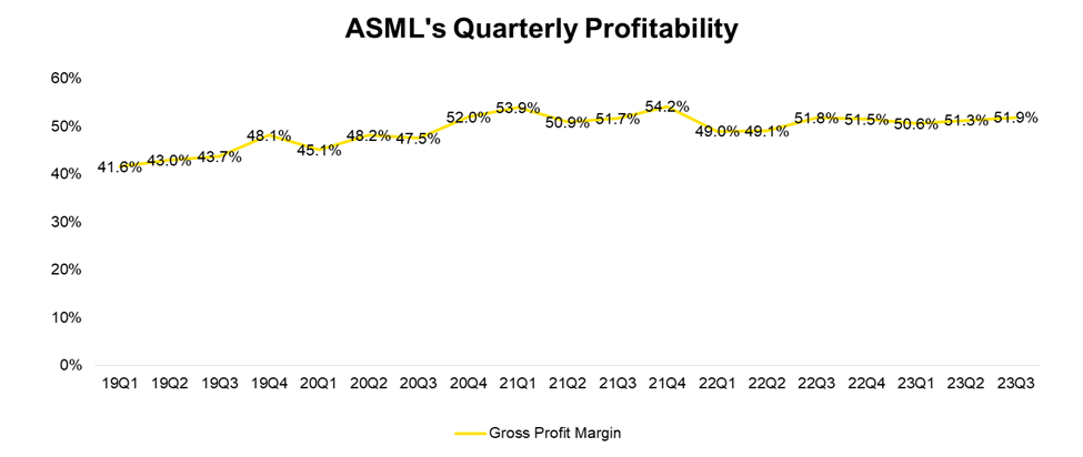 Hence, even though ASML's performance in 2024 might appear subdued, it's worth considering that the current P/E valuation has receded to approximately 29 times, close to historical averages. If there is a resurgence in semiconductor demand in the future, ASML might align with sector rebounds. Looking ahead to 2025, the management continues to forecast revenue reaching 30-40 billion euros, with a gross profit margin ranging between 54% to 56%. Based on these projections, revenue growth for 2025 could potentially reach as high as around 30%: